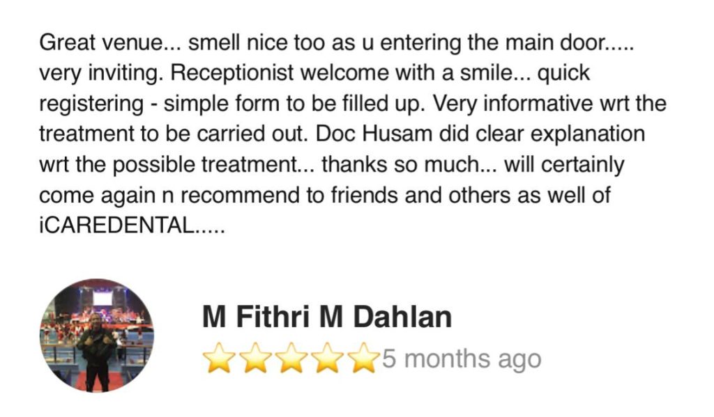 Datanglah ke Klinik Pergigian Icare Dental, saya akan memberikan konsultasi yang komprehensif dan detail untuk memastikan gigi anda sentiasa sihat dan kelihatan cantik.